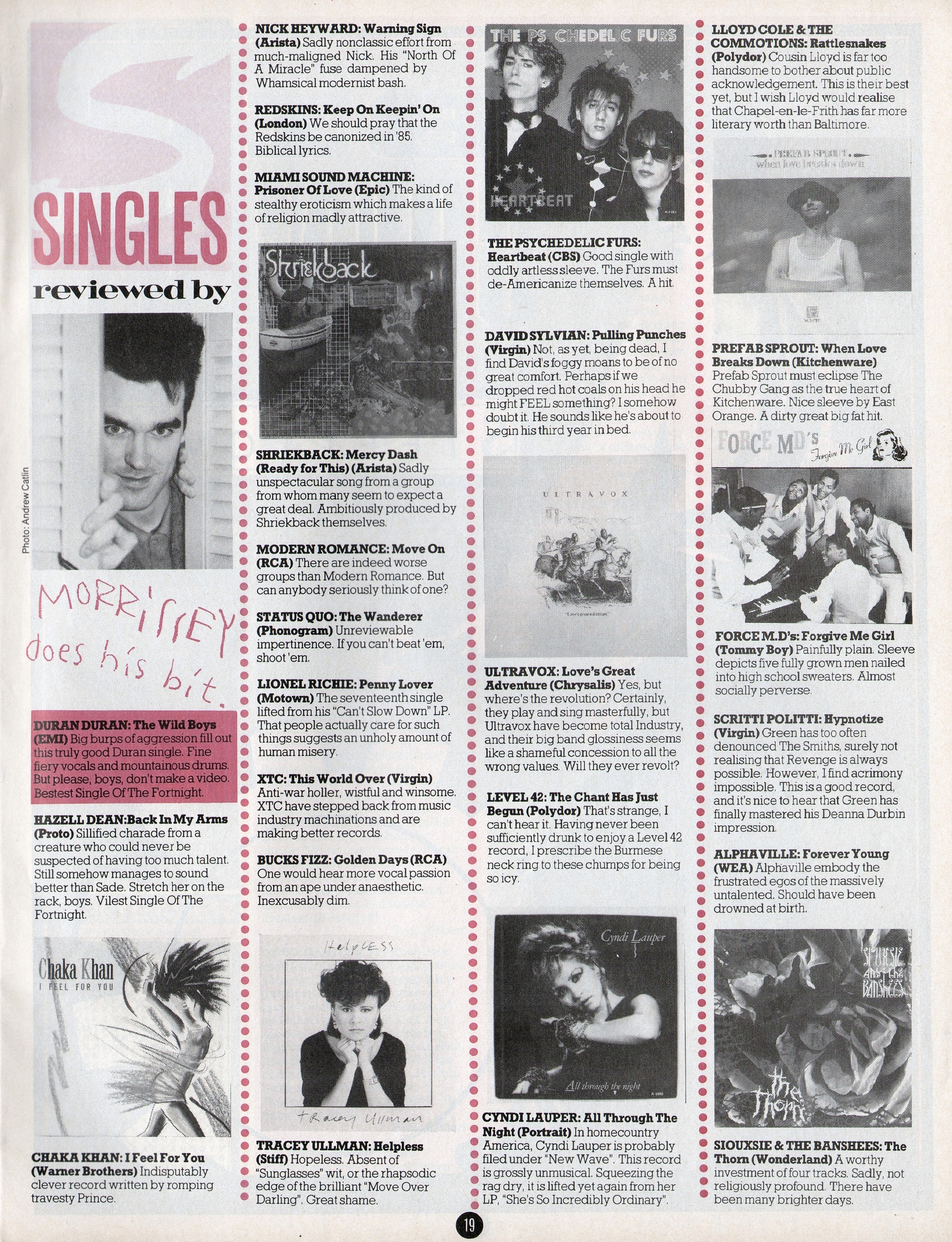 Back in October 1984, Morrissey did a feature with British music magazine Smash Hits where he reviewed some popular singles at the time. It was unearthed today (30 years to the day after the issue's publication date) by Brian McCloskey, a collector of the magazines who has been uploading his archives digitally on his blog Like Punk Never Happened. It's all pretty great. Here's Moz on Cyndi Lauper's "All Through The Night": In homecountry America, Cyndi Lauper is probably filed under 'New Wave.' This record is grossly unmusical. Squeezing the rag dry, it is lifted yet again from her LP, She's So Incredibly Ordinary." Woof, Moz! Tell us how you really feel. You can check out the whole thing below to see his reviews of Siouxsie, Duran Duran, XTC, and more.