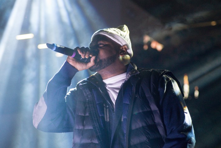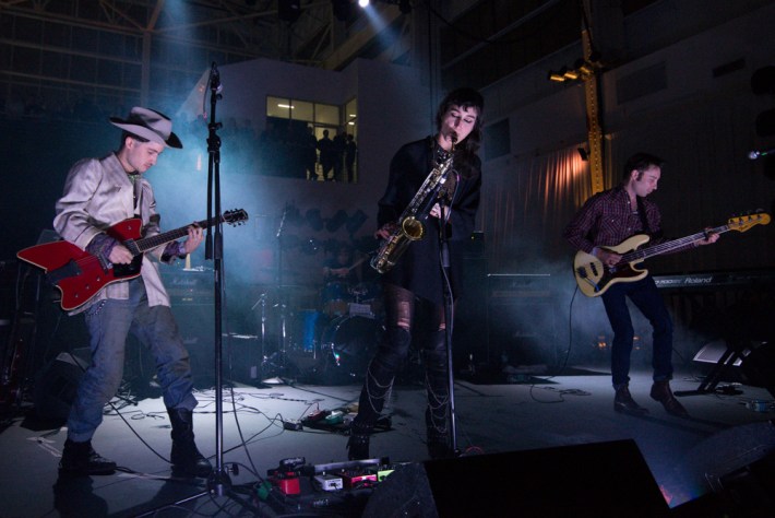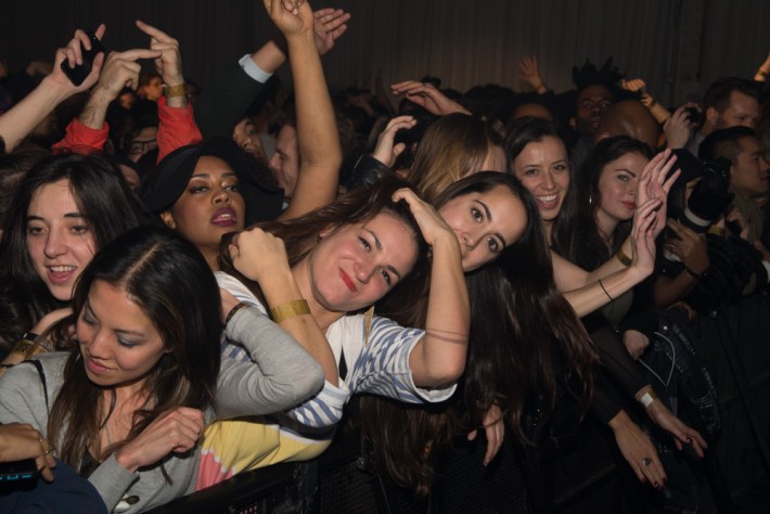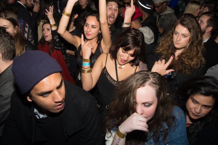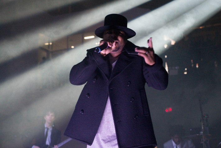 Once you got past the big concrete gates to the Yard and the somewhat surprisingly glacial-paced check-in line, there were fancy shuttles with lots of little blue lights inside them that took you a few blocks away to the Greenhouse. The music didn't start until almost 11, so for the first 90-ish minutes, people milled around inside the gigantic white room inside the Greenhouse, taking advantage of Vice's free drinks. Now that the company's valued at 2.5 billion dollars, it was nice of them to buy everyone drinks (and falafel) for a night. There was a DJ for this first chunk of the night, wisely sprinkling NYC favorites liberally into the mix -- everyone around me was psyched for LCD Soundsystem's "Someone Great," and there was also a really cool remix of the Talking Heads' "Once In A Lifetime."