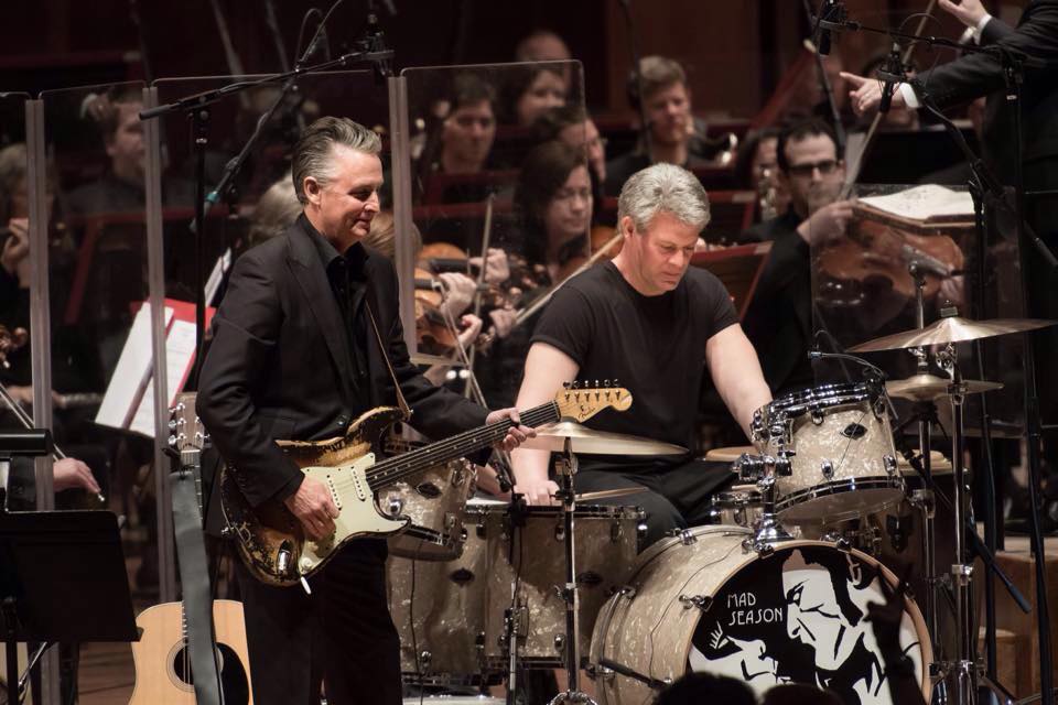 Two grunge supergroups reunited in their home base of Seattle last night for a special concert called Sonic Evolution. Mad Season performed for the first time in 20 years with a lineup consisting of Soundgarden's Chris Cornell, Pearl Jam's Mike McCready, Guns 'N Roses' Duff McKagan, Barrett Martin, and the Seattle Symphony. Cornell and McKagan replaced late musicians Layne Staley and John Baker, who were originally on vocals and bass respectively. They played "River Of Deceit," "I Don't Know Anything," and "Long Gone Day." Cornell also joined Pearl Jam's Jeff Ament, Stone Gossard, and Matt Cameron for a reunion of their one-off project Temple Of The Dog (without Eddie Vedder) and performed two tracks: "Call Me A Dog" and "Reach Down." The last time they reunited was for a Bridge School Benefit last year. Watch all of the performances below.