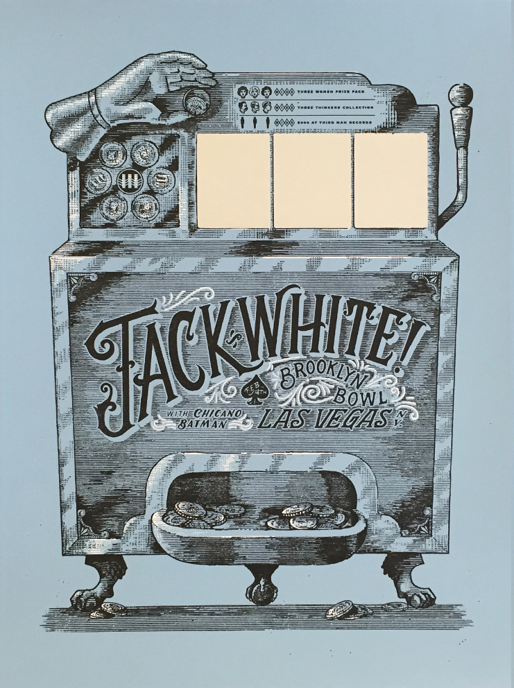 Jack White loves limited edition oddities, and he especially loves limited edition oddities that have something to do with him. Back in 2012, we wrote about a very limited edition "Triple Decker Poster" (which sold for $280) designed by Matthew Jacobson, of which there were only 75 made to accompany the release of Blunderbuss. Jacobson and Shelby Rodeffer have designed a new "scratch-off" poster for White's Las Vegas shows, which comes with a specially designed coin to scratch and expose underlying images. If you're lucky and scratch a winning combination, there are a few prizes involved.