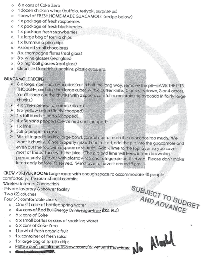 • And, most infamously, White wants homemade guacamole, and he's got a half-page-long recipe for exactly how he wants it made.