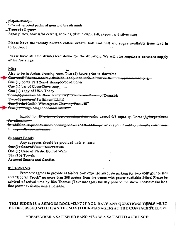 Most of the requests are pretty run-of-the-mill. Sandwich ingredients, sodas, pretzels and the like fill the bulk, though they do ask for a pound of butter, a quart of macaroni salad, and, in one of the more disturbing food requests I've seen, "One Jar with 6 Hot Dogs (Frankfurters)." A jar? Oof. It gets pretty specific further down when they request one large package of Skittles, separated by color to appease their obsessive-compulsive bassist. Things get particularly weird in the "Misc" section, where they ask for one refrigerator magnet of local interest, and one small Rhesus monkey skeleton. However, the comical band, who, remember, demands to be taken seriously at the beginning of the rider, parenthetically assures the reader that this is in fact the only non-serious item on the list. Thanks for explaining the joke you included on your serious document, you joke band that demands to be taken seriously!
