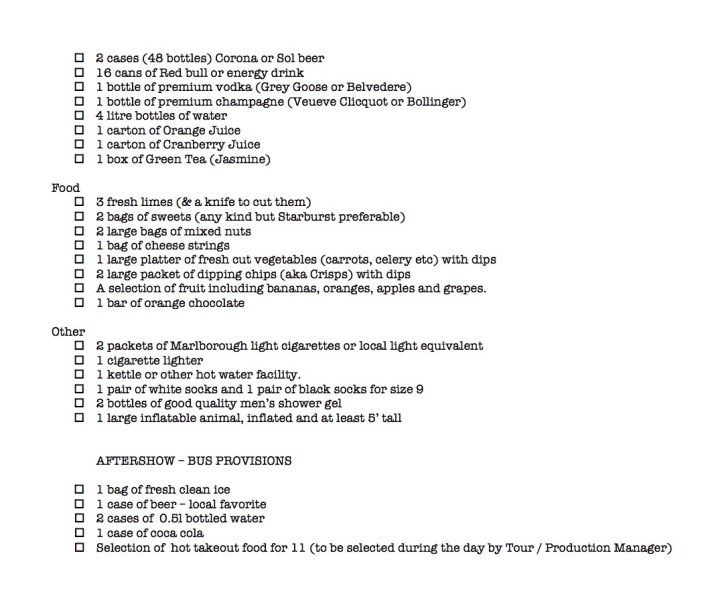 It's no surprise that Van Halen's 1982 tour rider tops this list, as it's been the rider to out-crazy pretty much ever since it was first released to the public. This was a time when Van Halen's star was rapidly rising, and they were soon to be just about the biggest name in rock music. The document breaks down meals by even and odd days, with multiple choices for each day, but things don't really get interesting until we get to the drink list. How does a band of wild rock stars party? With a shitload of booze, it turns out. Massive quantities of Budweiser, Schlitz Malt Liquor, Jack Daniels, Stolichnaya vodka, Southern Comfort, and white wine are requested. And, of course, in between two bars of soap and 3 packs of Marlboros, the band humbly requests one large tube of KY Jelly.