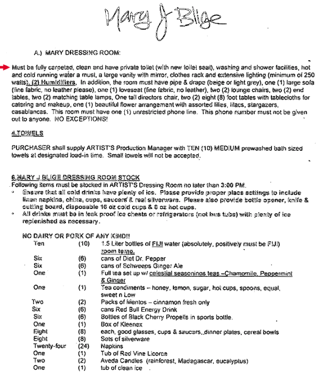 A clean and carpeted dressing room isn't such a strange request, nor is a private bathroom. But Mary J. Blige takes it a step farther when she adds that the toilet seat must be brand new. That's a new toilet seat for every tour stop! I wonder if the venues are allowed to leave the toilet seat on once she leaves, or if she has it destroyed once it's seen it's last use by her. Things get a little specific when it comes to hotel accommodations as well, where Blige, who up until this rider leaked checked in under the pseudonym Mrs. Jefferson, insists she not appear on any room number list, and that her room be in the most quiet area, on a non-smoking floor, and not on the same floor as the rest of her crew or touring party. The demand for quiet also includes that Blige be notified of any construction going on near the hotel, and that the housekeeping staff honor the "Do Not Disturb" signs, a point made with not one, but 26 exclamation points. They are not to knock to verify occupancy, or even vacuum nearby rooms, even though such noise might be drowned out by the two humidifiers also requested. Listen, there's a reason singers like Blige are referred to as divas, right?