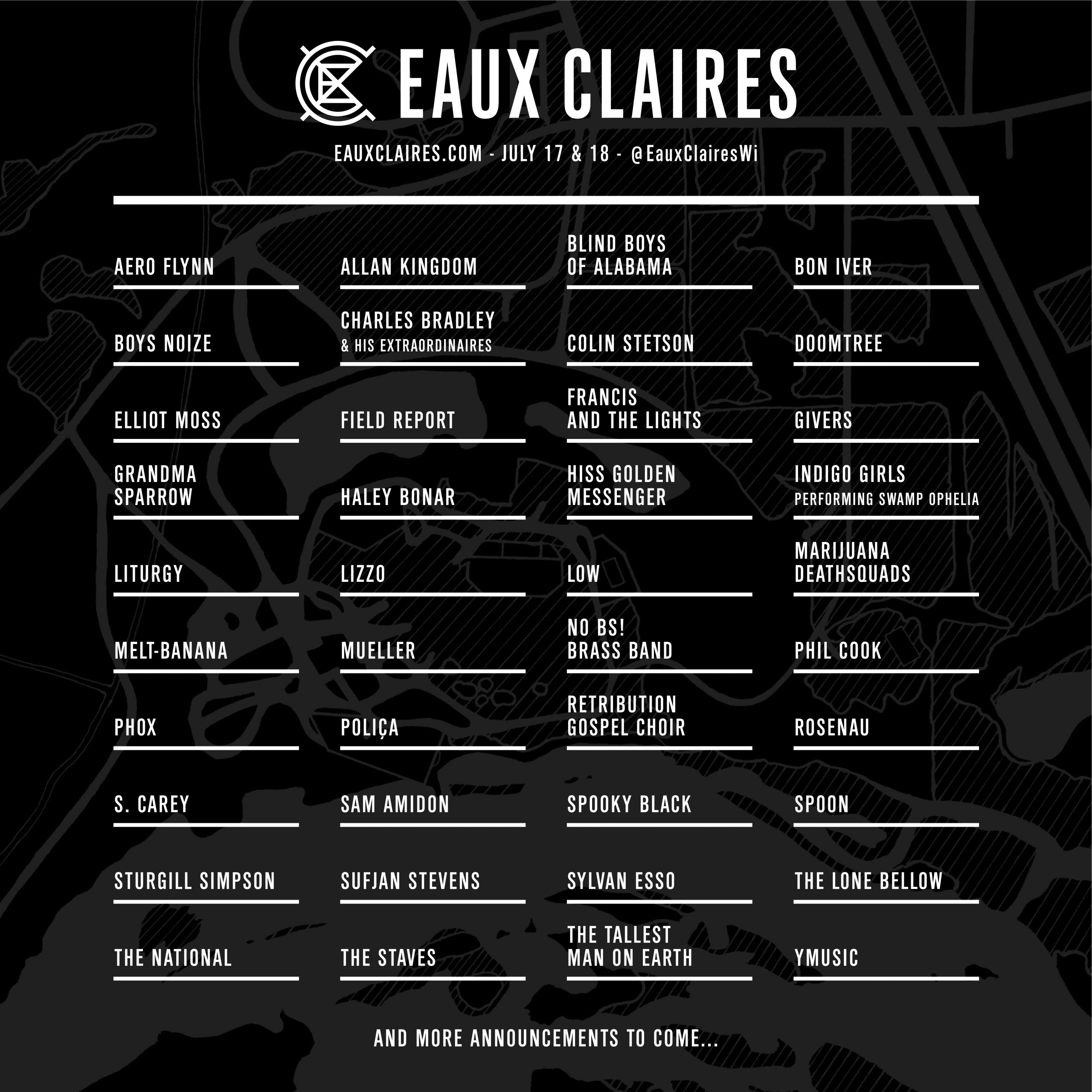 The lineup for Justin Vernon and Aaron Dessner's Eaux Claires festival is here, and as you might expect, it's both charming and formidable. Bon Iver will headline -- their first live performance since November 2012 -- alongside the National, Sufjan Stevens, and Spoon. Vernon's fellow folk-rockers the Tallest Man on Earth, Sam Amidon, and Hiss Golden Messenger are among the 40 artists confirmed today, as are cult favorites the Indigo Girls (performing Swamp Ophelia) and Low. The diverse lot of artists ranges from rising country kingpin Sturgill Simpson to experimental aggressors Liturgy and Melt-Banana to soul legend Charles Bradley to DJ duo Boys Noize to rapper Lizzo. Lots of Vernon associates are on the bill too, including the Staves, the Blind Boys Of Alabama, Aero Flynn, Colin Stetson, Doomtree, Haley Bonar, Field Report, S. Carey, Poliça, and Sylvan Esso. A press release also promises an emphasis on artistic collaboration within the lineup as well as "surprising collaborations across artistic mediums, and many other creative and experiential elements," all of which sounds extremely promising. It's going down at the Foster Farm outside Eau Claires on 7/17-18. Tickets go on sale here Thursday 2/12 at 1PM EST/12PM CST.