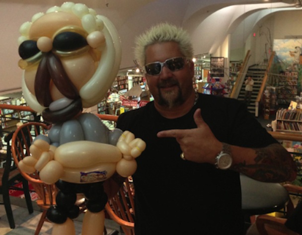 Guy Fieri with what is, I guess, a balloon version of Guy Fieri in what looks like a bookstore? His balloon eyes representing sunglasses, but looking more like nightmare bug eyes? Holding I don't know what? A hot dog? A butt, kind of? Chicken breast? Is that what you're looking at today? Because that's the best I've got on my end! Just this photo of Guy Fieri with a balloon version of Guy Fieri, a bunch of tumbleweeds, some stuff about how they're making two 50 Shades of Grey movies, one NC-17 and one R, and some leftover dirty garbage about fake Twitter airplane wars or whatever. Are you asleep? Is everyone asleep? What's up? Did any celebs go to the grocery store and buy bulk Snapple today, that you know of? Let me know! PLEASE! I AM SNOOZIN FROM ALL THIS LACK OF "NEWZIN." (Photo via RatsOff!)