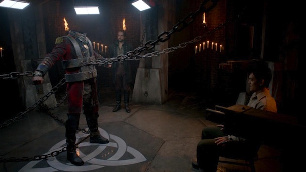 The teams reunite. Unbeknownst to them, Zombie John Cho has smuggled the hex-removing pog slammer into the panopticon in his decomposing stomach fanny pack. He whispers Voldemort to it, granting the rescue demons full access to the tunnels. So while Abbie and Jenny and OJ blast the infiltrating demons with shotguns, making them explode into (really pretty sick-looking) demon dust, Ichabod stays with Headless, who immediately rips off his chains and challenges Ichabod to another v sweet sword fight, which leads Ichabod to deduce via leg sweep memory that Pre-Headless was actually Abraham with a head tattoo and a Bane mask who was resurrected into Headless by Molester Tree Demon. You know!