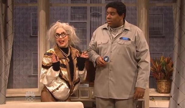 Besides the monologue, there were two sketches you won’t find on Hulu. One is a scene from the future with older Lady Gaga as a forgotten former star. Kenan comes in and doesn’t understand her, even when she's all like, “Telephone?” “Paparazzi?” and does a little medley. Again, props to her for making fun of herself but the sketch is still low/medium levels of funny.