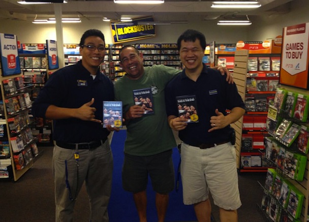 The final Blockbuster rental happened in Hawaii on November 9th at 11PM, and will live on forever in this photo which was tweeted today by the Blockbuster Twitter account. It is, appropriately, the movie This Is the End. Man. I thought I didn't care that Blockbuster was closing because first of all I thought all of those stores closed a bunch of years ago and second of all it is just a chain of stores and do you know what is happening to human beings these days?, plus third of all it's 2013 and human beings have evolved to not care about(/pay for) anything, but man is that Twitter account sad! And looking at the Blockbuster logo is making me kind of sad! Man oh man. Listen, do NOT go to the Blockbuster Twitter account page. Just stay here, think about how we and everyone we love are all going to die someday, and CAPTION THIS FINAL RENTAL!