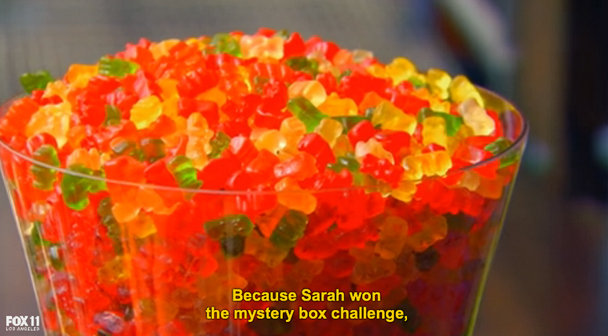 Sarah’s sardines won the challenge so the MasterChef Junior people awarded her with gummi bears! I get that it’s a reference to when she said that the gross ingredients were “so not gummi bears!” (LOL – kids!) but the amount of gummi bears is just inappropriate. Are the MasterChef Junior people trying to flaunt how much cash they have lying around to waste on unnecessary prizes that will actually promote Sarah’s scary, competitive attitude?