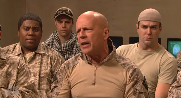 Two things I learned from Bruce Willis's harMONicOLOGUE (n, a monologue in which speaker plays harmonica) are that a) Bruce Willis plays harmonica, and b) this week was the first time he's hosted SNL since 1989. Wow! One more year and it could've been the 25th anniversary. Who planned this, because you done messed up! Kidding. I'm just kidding, it's fine. Truly JK. Anyways, although Bruce Willis is an entertaining enough comedic performer (have you seen him in The Whole Nine Yards?) [Ed. Note: AND REMEMBER WHEN HE WAS ON FRIENDS?], the material in this episode was maybe too tailored to his sensibilities and action movie tropes, seeing as how the show turned into mostly boys being boys. We get it, boys! Some of it was funny though, just also some of it wasn't. Here we go:
