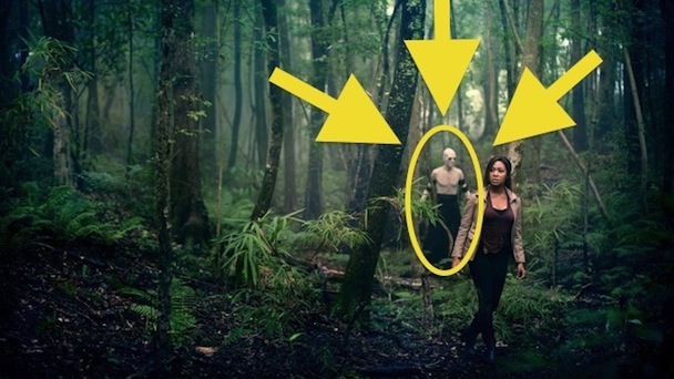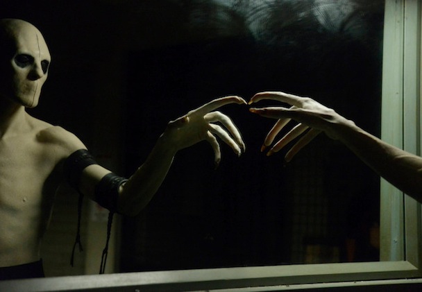 Abs and OJ and Doomed Forensic Psychologist are in the observation room watching Ichabod interrogate someone who is revealed to be -- you'll never guess -- or probably you will if you watched last week -- Abbie's sister! The sporty one! (Also the crazy one!) You watched/remember. This really upsets Abbie, who carries with her everywhere an infinite supply of sororal guilt, so she rushes in to stop Ichabod. Then the whole scene gets v spooky. Abbie's sister disappears. White Hot Topic contacts suddenly appear on Ichabod's eyes. All the doors slam. And then The Faceless Nightmare Monster sneaks up behind Abbie, and reaches his gross hands out toward her voluminous hair!