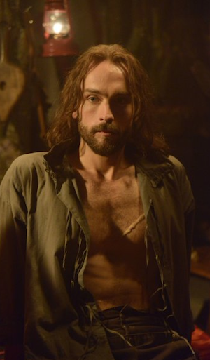 One problem: The United States basically murdered all the Native Americans. (But it's chill, the three who are left own casinos and Nicholas Cage made Windtalkers, so it's even.) The only Native American left in Sleepy Hollow is the used "motorized carriage" salesman who is a jerk, until you ask him to stop being a jerk and he instantly ushers you down to his Sandman battling chamber. He explains that Abbie has to reverse-incept the world of The Sandman's dream and confront her guilt about not backing up her sister about Molester Tree Demon. First though, she has to drink blue Gatorade, which will make her sleepy. After, she must get stung by a scorpion, which will make her impervious to sand or something. Abbie sips her blue Gatorade and is all ready to face The Sandman alone all on her lonesome, when our heroic handsome hero Ichabod snatches up the Gatorade carafe and chugs it. Aw! Abbie & Icks take their shirts off (I was too verklempt to screen grab), are bound to massage tables, and have their flawless stomachs STUNG BY SCORPIONS. (WBOAT, anyone?) They enter the dream world and Abbie is ready to cap a Sandman.