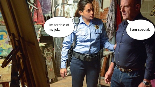 Then the Policewoman comes in to talk to Big Jim and says the thing about "pink stars are falling in lines," which Big Jim had somehow never heard up until this point, except for WHEN HIS WIFE ALWAYS USED TO SAY IT BEFORE SHE DIED! He brings Policewoman to his deceased wife's art space where she had a million paintings of black eggs and pink stars falling in lines, as a bunch of Under the Dome set design interns excitedly text their parents. Policewoman tells Big Jim that he and his family are "special," so now he thinks they are special. But Journalist also thinks she is special! UH-OH!