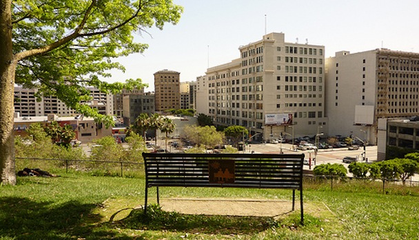 Ever since (500) Days of Summer was released in 2009, a downtown L.A. park bench that's central to the film's love story has been a tourist draw, particularly for fans looking to re-create the iconic shot of Joseph Gordon-Levitt and Zooey Deschanel as they gaze across the city together. But the sloped grassy expanse, called Angel's Knoll, was fenced off and closed July 30 due to state cutbacks. (The defunded Community Redevelopment Agency could no longer maintain it.)