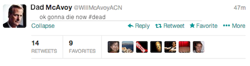 Real talk: There is so much Twitter on this show! What crazrs were to Entourage, Twitter is to The Newsroom. Or as Will McAvoy would put it, "@me: crazrs : Entourage :: twitter : Newsroom. Plz RT." There are two Twitter subplots in this episode alone. According to my math, that is approximately fifty more Twitter subplots than any show ever needs, especially when they're alongside the Man-Stuck-Under-Building-Prank-Call subplot and Whatever-Don's-Story-Line-Was subplot (I refuse to write about either, I went to college). There's the woman who tweeted about Will McAvoy blowing her off at T.G.I. Friday's, and there's Emily Mortimer's ludicrous deduction of the Rutgers bro's vague tweet about coming out on live TV. It's just so much Twitter! By the last scene I was genuinely surprised that Will McAvoy's dad didn't live-tweet his death.