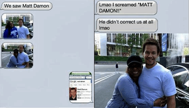 From LAist: "Mark Wahlberg played it very cool when a fan mistook him for another well-known Boston actor, Matt Damon. The fan and her friends posed with Wahlberg and then shared photos of their encounter, boasting 'We saw Matt Damon!' Wahlberg never let on that the fan had made a mistake and later posted the photos to his Facebook account, saying, 'Close enough.' The fan later realized she'd ID'd the wrong guy, saying, 'He didn't correct us at all, LMAO.'"