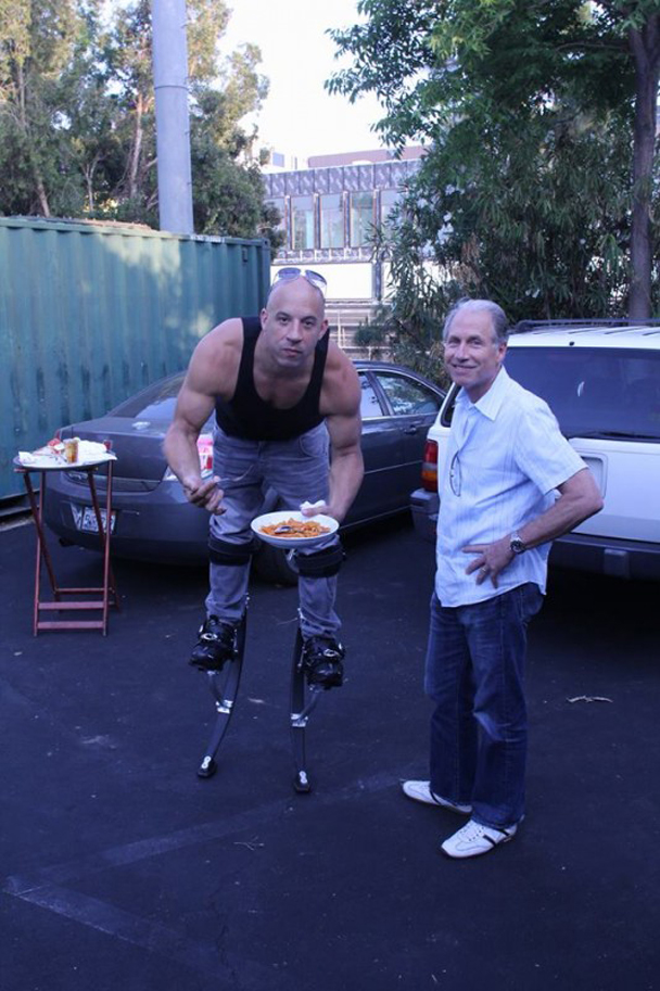Photographer: Alright, Vin, let me get a shot of you eating spaghetti while you're on stilts.