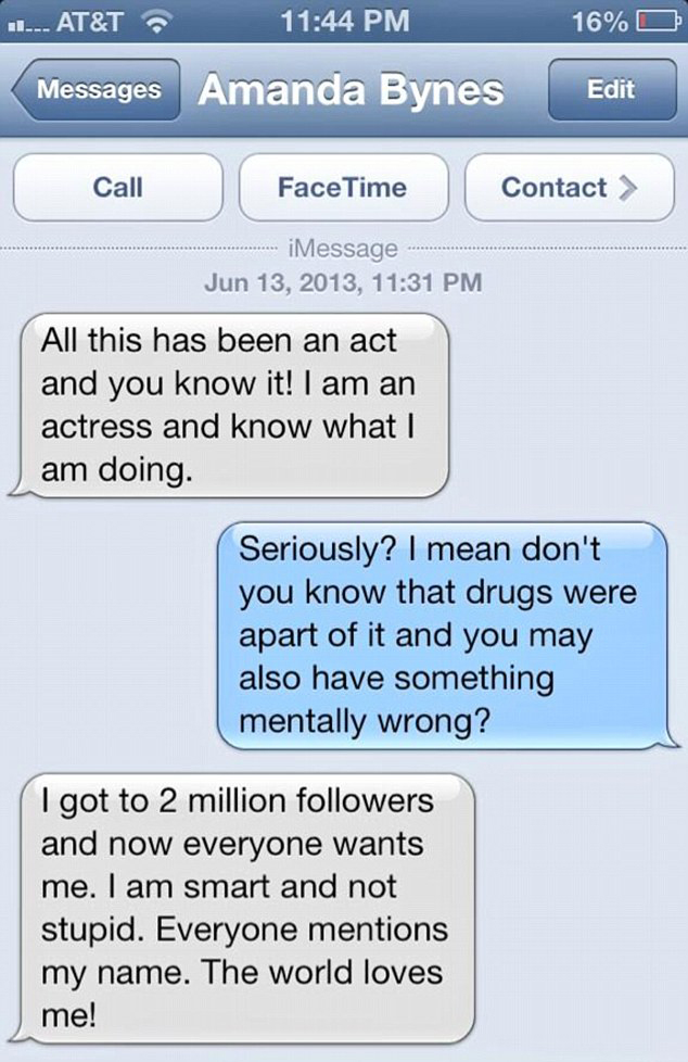 A supposed long-time friend of Amanda Bynes tweeted this and other screengrabs last night of texts the actress supposedly sent him in which she explained that her recent (and on-going) public meltdown was all just a carefully orchestrated performance achieving its intended outcome of garnering attention for the young star. Great. First of all, I wish that it were true! I wish Amanda Bynes was just tricking us all into liking her even more! (Although, her supposedly lucid argument that "everyone wants [her]" and that the "world loves [her]" seems a bit disingenuous. Everyone for sure is cruelly and inappropriately laughing at her? The world doesn't care about her mental well-being?) I do love the way these texts were written, and how it is not a way that anyone writes texts, much less a drug-addled child star living alone in a filthy Tribeca loft or whatever the hell is even going on over there. "Wait, so Amanda, you are telling me that this was all just a genius plot concocted by a genius?" "Yes, my good friend for many years, that is what I am telling you." Frankly, I don't buy any of this, but even more importantly, fuck this friend a million ways for posting these photos because no matter what it is a lose-lose. Either he is simply disregarding what minor shred of privacy Amanda Bynes even has left by publishing personal messages intended for one recipient, which, RUDE, and even worse, no matter what, some people are for sure going to see this as a license to continue to tease, mock, ogle, gawk at, and otherwise torture a young woman who is clearly in need of professional help. Bad News Bears. (This is what the movie Bad News Bears was about.) In conclusion, uh NO, we are not not allowed to make fun of Amanda Bynes again. She is sick! Amanda Bynes is a sick lady! Give her some medicine!