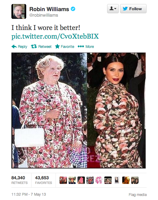 KABOOM! Robin Williams burned Kim Kardashian so hard on Twitter! LOLOLOL! Ouch. Sucks 2 be Kim. I suppose one could also make the argument that it sucks to be a full grown, 61-year-old man taking pot shots at a woman half his age on social media for the clothes that she wore while seven months pregnant. You know, that too. I'm not saying it wasn't a KILLER burn. Such a good burn. OH BEHAVE! Wait, no, that's Austin Powers. But you get the idea. So fun and funny. We should all be so lucky when we are Robin Williams's age to be able to just have so much FUN with stuff, you know? Go crazy, enjoy it, YOLO. Personally, as a 54-year-old man, I am looking forward to the peace and presence of mind that I expect the next 10 years to bring. At a certain point, I imagine a life for myself in which the constant need for attention and validation diminishes, where I can feel a certain satisfaction in the work that I have put in, and whatever rewards that work has brought me, either financially, professionally, or spiritually, and while I will never withdraw from the world, for that is not a way to live, I will engage with it in a deeper and more nuanced fashion that reflects my own inner-resources and the hard-earned lessons I will have absorbed. I will recognize that fame is a complicated and dangerous power source, and that those who are caught up in its maw should not be revered or even necessarily celebrated, but they should continue to be thought of as human beings, and that as such they deserve our patience and a modicum of respect. I'm not there yet, but eventually I would like to see the world through the eyes of someone who simply appreciates his place in it, and doesn't feel like that place is constantly being threatened by the place others have found for themselves, and when he sees someone doing something silly or stupid or embarrassing or unfortunate, he will simply wish for them a future in which they come to the same conclusions, a future in which they, too, find themselves more deeply engaged with the world than they ever thought possible, happy for the simple privilege of getting to be a part of it. Then again, who knows, maybe when I am 61 years old I will just want to diarrhea in everyone's face because who even cares death approaches and quickly. I CAN HEAR ITS FOOTSTEPS! (Click through to enlarge.)