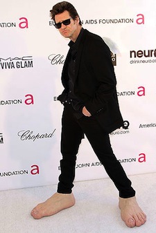 Life can't be all work and no play. Actually, it certainly can be all work and no play, but having a life that is all work and no play is absolutely not the ideal. I think we can at least put down our nitpicking for one second, for once in our lives, and agree on that. As John Terrance famously said in his movie The Shine, "All work and no play makes Jack a dull boy." I like to believe that's what Jim Carrey was practicing in his appearance on the red carpet at Elton John's annual AIDS Foundation’s Oscar Viewing Party over the weekend in Los Angeles when he chose to wear fake big feet instead of shoes. "Assistant, put those tasteful loafers in the garbage and get me my feet." "But Mr. Carrey--" "Please, I'd really prefer that you call me Jim," "Ok, ah- But Jim," "Yes?" "Jim, don't you think the big feet will be weird and confusing, especially when they are given no context? Like in an Internet caption contest, for instance. Or even in the blog where the Internet caption contest originally found the image? I mean, I'm sorry if this is out of line--" "It is." "Ok, and I'm sorry, but I'm not even sure what the context would be if anyone even wanted to provide it? Do the feet have something to do with giving money to AIDS research?" "Are you kidding me? Give me my fucking shoe feet and shut your mouth. I'm trying to have fun." And Jim Carrey was pretty much right! That person should have just given him the shoe feet! What's it to him or her anyway! #YOLO #YOCTOAIRN (You only caption this once and it's right now.)