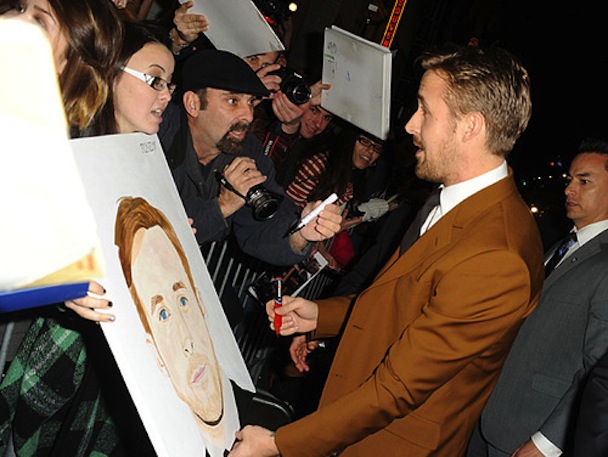 Ryan Gosling attended the premiere of his new film Gangster Squad last night with his mother as his date. His mother, when asked about what she was wearing, responded, "I'm wearing Eva Mendes." AHHHHHHHHHHHHHHHHHHHH! Is that why Ryan and Eva didn't spend New Year's together?! Is that why Eva wasn't his date to the premiere? Did Ryan Gosling's mom murder Eva Mendes in order to wear her beautiful body to the premiere of Gangster Squad?! NO! YOU WEIRDO! She just meant that all of the clothing she was wearing belonged to Eva Mendes, and she was borrowing it. Man, you are so gross. (But also, what? All of these clothes belong to Eva Mendes?) (Huh?) (She does look beautiful.) (And tasteful.) Anyway, while the sweet, beautiful Ryan Gosling stopped to sign autographs at the movie premiere to which he sweetly and beautifully brought his mom, a fan presented him with a sweet, beautiful painting of his big face staring straight back at him, blankly. What every man wants! She did the work creating this wonderful piece of art, and now you have to do the work creating a CAPTION FOR IT! That's how art works! Ask a museum! Get to work!