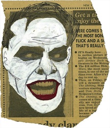 In 1980, while scheming a silver screen pitch for bringing the grittier version of the "Batman" to Hollywood, [Michael] Uslan came across a promotional image of Nicholson's character from "The Shining" in the New York Post, in his iconic pose: eyes bulging, and head bursting through the door frame yelling "Here's Johnny!" Uslan painted over the image with whiteout and transformed Nicholson's furious features into that of the clownish villain.