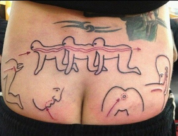 "OK," you are probably saying, "this is admittedly over the top and that sure is a LOT of Human Centipede tattoos for one person to have on their back, and the infographics for how the surgery is to be performed is new. But I have already seen plenty of Human Centipede fan art on Etsy or whatever, and it's 2012, man. This is old news. No one is talking about Human Centipede anymore. We have all moved on." Uh, yeah, I know, MY POINT EXACTLY. Tattoos are forever, guys. I really wish you would start being a little more deliberate in choosing yours. Your body is a wonderland. A scary, disgusting, laughable wonderland.