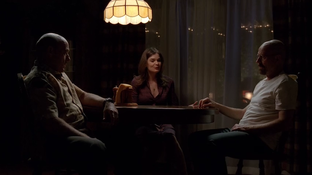 Skyler comes back and sees the cars in the driveway, then has a silent, helpless dinner with her husband and son while they talk about doing donuts and Walt Jr. says a curse word.