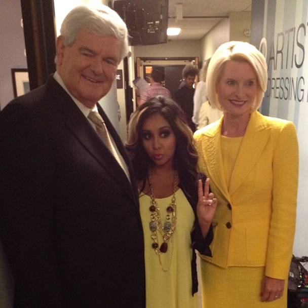 OH HEY! REMEMBER WHEN NEWT GINGRICH WAS BRIEFLY CONSIDERED A VIABLE CANDIDATE FOR THE PRESIDENT OF THE UNITED STATES?! Just kidding. No, I mean, he was, but this picture doesn't really mean anything. It's a classic case of PARTISAN POLITICS to look at this picture and think that it means anything. Because guess what: Barack Obama--excuse me--President Barack Obama referenced Snooki in a publicly televised speech, which is WAY WORSE! Admittedly, it was the White House Correspondents' Dinner, which is basically Washington DC's version of The Jay Leno Show (never forget), but still. That's the president! The good president! The one that we were like "oh man, love this guy!" So this is nothing. They met on the set of the Tonight Show with Jay Leno! Speak of the devil! Of course they did. What a great episode of the Tonight Show with Jay Leno. It's too bad they don't sell DVDs of that show! That show is a keeper. And so is this photo! What a cool press opportunity (cool press opportunity) for Snooki to look like she I don't even know what, and for the Gingriches to seem a little more youthful, a little less like a pair of philandering Crypt Keepers. Calista even tweeted it. Twitter! The kids love Twitter these days. Well, they used to. Pretty sure this tweet officially ended Twitter. Goodnight, Twitter! You were a beautiful bird that flew too close to the Provaxil. (I just made up that drug name! Because old people take drugs! And Calista and Newt are old! Please RT.) (Via @callygingrich via @artalamo.)