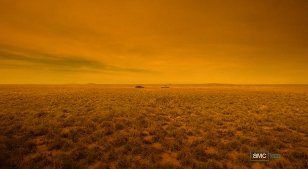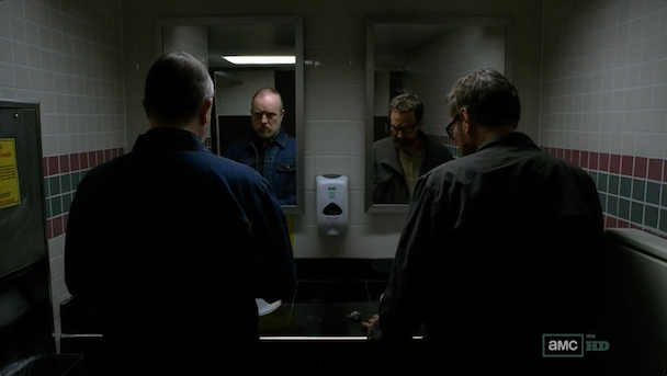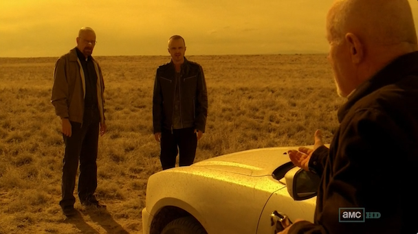 JK. It was a cheap camera trick! They didn't drive into each other at all! But they do meet in a desert, naturally, so Mike can yell at Walt about killing Gus. "DO YOU EVEN KNOW WHAT YOU DID?" he says. Jesse calms him down, though, with his beauty, and the gang decide to stay a gang because they're all in it together and then Mike gives "the universal sign for keys" and Jesse and Walt just have no clue at all: