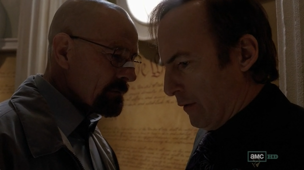 Later, Walt visits Saul and Saul explains all the wheeling and dealing he and Skyler did with Ted behind his back. He is visibly upset, but doesn't say anything and walks out of the office calmly and gets a caffeine-free soda at a gas station and watches a little TV when he gets home and then goes to bed. JK! He's very mad and Saul gets mad back, and then we see the ricin cigarette he took from Jesse! ALL OUR OLD FRIENDS, INDEED! Saul confirms that whatshisname took the cigarette from Jesse, and tells Walt that he never knew Brock would end up in the hospital, and that he doesn't want to work for him anymore. Then Walt goes in for the big smooch:
