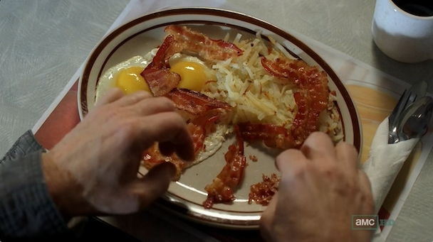The episode opens with a flash-forward to one year(ish) in the future, Walt's 52nd birthday. I guess? For some reason we are forced to believe that he has chosen to list his real birthday on his fake ID, and also that he has chosen to name himself after Adam Lambert. Whatever. To each his own! Originally I thought that he was making a penis with his bacon: