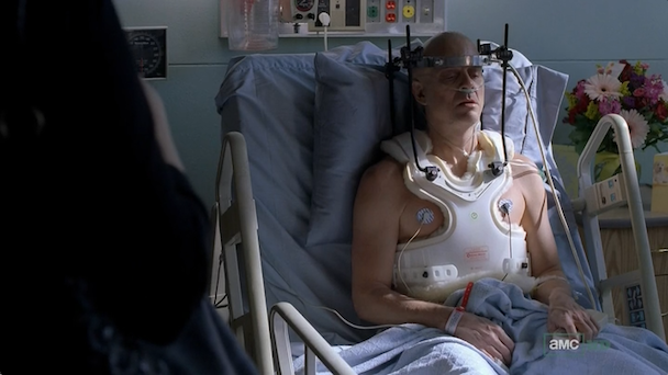 WHAAAAAAAAAAAAAAAAAAT! I thought he was dead already! What a shock. Skyler goes to visit him in the hospital and he is looking a lot like the "jump to conclusions mat" character from Office Space: