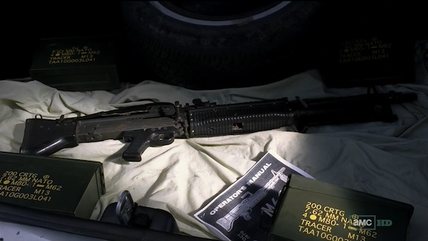 After the guy gives him the keys in the bathroom the guy says, "Well, good luck. I guess." Uh-oh! The scary guy is even unsure of what Walt is doing! WHAT COULD HE BE DOING? After we see the gun in the trunk, we are flashed back to the present, where Skyler is talking to Walt about how Gus Fring is dead and Walt is taking forever to answer her, before finally saying that he won. "I won." After getting off the phone, he puts a bunch of evidence into the trunk of his car -- including the Lily of the Valley plant -- and changes from a green shirt into a nice blue shirt. Looking good, Mr. White! Now you can finally drink that drink you poured, congrats.