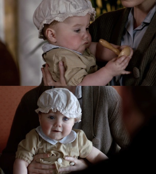 My goodness, there is so much episode left. Let's zoom through a few things. The Lord visits Branson and tries to offer him money, which he declines, no duh, and then tells him to get out of town. Branson tells him as soon as he gets out of town Sybil will be getting out of town with him, soooooo. The Lord is foiled yet again. The wedding has to be postponed because everyone is very sick with Spanish flu and Cora is breathing like a demon. Bates did he marriage thing and he and Anna are going to be married Friday afternoon. O'Brien wants to confess to Cora that she is the reason why Cora lost her baby, FOR WHATEVER REASON, THAT WILL DO NO ONE ANY GOOD, O'BRIEN, but she never does. The Bryants come to Downton to see the maid's baby, and they tell the maid that they'll support the baby but only if she gives the baby to them and never sees him again. It's horrible! The wife doesn't seem to support this idea, but the mean mustache husband does. Also: the baby is INCREDIBLY cute:
