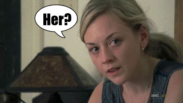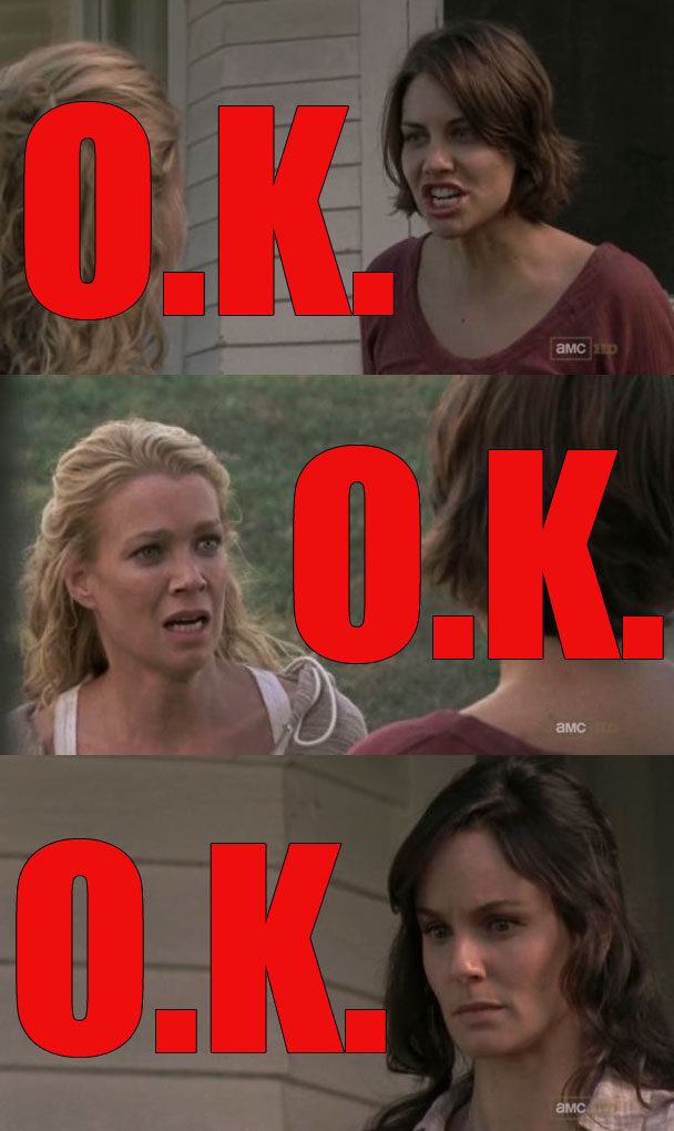 Meanwhile, back at the farm house, hell is other zombies with nausea or whatever. That girl who passed out last week is now having an existential crisis and wants to kill herself. Good. Let her. She is going to do it with a steak knife? Perfect. Lori takes the knife away and gets the girl in trouble with Maggie. Andrea tells Lori that she should let the girl make her own decisions. Lori tells Andrea that she should do laundry. There's actually a very weird scene in which Lori and Andrea have a not-so-coded debate about the continuation of standard gender norms in a post-Apocalyptic nightmare, although not even, because it IS still 2012, right? We don't all think that women should just leave all of the hunting and gathering to men and the women will do the warshin' up? Just Lori. Because Lori DEFINITELY thinks that. "The men don't need your help keeping us safe," Lori says. Eek! Lori! You have always been the worst, but now you're the worst in a new way! Upstairs, the girl explains to Maggie that not only does she plan on killing herself, but she wants Maggie to kill herself too, and for them to kill themselves together. AHAHHAHAHAHA. Do it! Do it, Maggie! Do it! That is the best. How often do you think that works? "Don't kill yourself, please, I love you and don't want you to die." "Oh, not only am I going to do it, but you're coming with me." "In that case, let me change my dress."