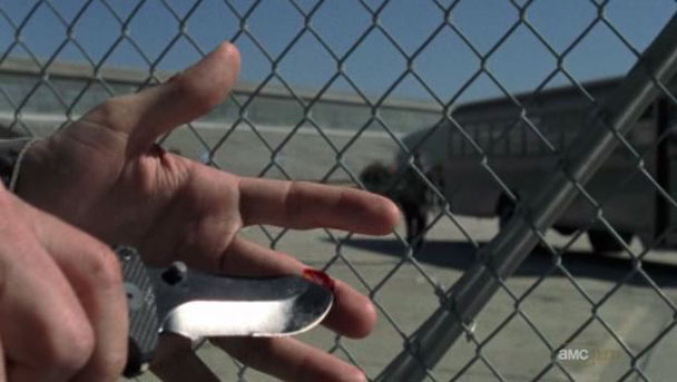 Will it? Based on what information? There is a zombie in a rent-a-cop uniform approaching them, and Shane is about to shoot it when Grimes says they should use their knifes. He cuts his finger open and rubs blood on the fence and when the zombie licks the blood off the fence he stabs the zombie in the head with his knife. Uh. I mean, yes, save ammunition and don't make so much noise all the time, but you also live in a world without doctors and a very limited amount of hard-to-reach medical supplies so maybe don't go carving into your body with a dirty knife and rubbing the open wound all over zombie-infested rust metal? That's Grimes's big strategy?