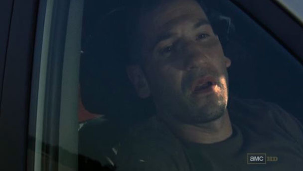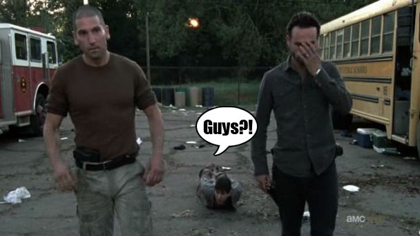 They're about to leave the tied up boy in the parking lot when he starts begging for them to save him and says that he is friends with Maggie. Uh oh! So, after all of their arguing and driving 18.7 miles and finding the perfect spot, it turns out the dude knew where the farm was the whole time? LOL. That's a classic LOL. Good work, boneheads! Shane shoots the kid in the face, but Grimes shouts NO and shoves the bullet into the dirt. He says he needs a night to sleep on it. For what? I mean, either you shoot the boy or you take your chances and leave him here, but what is there to sleep on? You're going to wake up, have a glass of orange juice, and THEN shoot him? Shane and Grimes argue, of course. Every Day I'm Arguin'.
