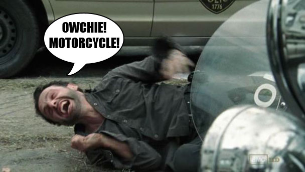 Grimes says that it's not Shane's call. Why not though? Who undied and made Grimes the boss every step of the way? He says that Shane has to follow his lead on this one. Again: does he? Why does he? Shane says Grimes was right the first time, Shane doesn't think he can keep Lori and Carl safe. So Grimes tries to punch him. Poor Grimes. Kind of showing your hand here, Grimes. Maybe you CAN'T keep Lori and Carl safe? It's like Shane called Grimes gay when Grimes was definitely a self-loathing, closeted homosexual. "If I'm gay, then why would I punch you for calling me gay?" Shane catches Grimes punch and head butts him. And then the men proceed to have sex for five minutes. Seriously, the amount of grunting is hilarious. So much grunting! Boys! Stop fucking for a second! The boy is going to get the knife! Fight fight fight. Fuck fuck fuck. At one point, after they've been fighting forever, Shane says "get off me, man!" which is a very funny thing to say to someone who is trying to kill you and has been for the past five minutes. "Get off me, man." Oh, sorry. I didn't realize that you DIDN'T want me to sit on our chest and punch you in the face. Shane drops a motorcycle on Grimes.
