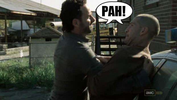 Haaaa. Then he throws a tire iron at Grimes and it goes through the window and THAT is what wakes up all the zombies. Here they come! It's the zombies from the beginning of the episode. HI ZOMBIE PALS!