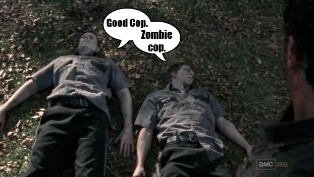 There is another rent-a-zombie and he tells Shane it's his turn. Later they will drag the zombies to a place on the grass and lay them down together for some reason. (The reason is so that Grimes will be allowed to see them lying side by side and be reminded of how there used to be a time when him and Shane would wear their uniforms and lie down in the grass together and talk about what animals the clouds looked like. But there's no other purpose for it.) One of the best uses of your time and energy in a zombie Apocalypse is to move the dead zombies around a lot. Put them here and put them there. It's important to do so just do it. Shane will point out that he doesn't see any bites. Grimes will say that they must have zombie scratches. Must be scratches, I guess, Shane agrees. OK, so it's scratches. Everyone agrees it's scratches. Let's not worry about it anymore, I'm sure it's just scratches.