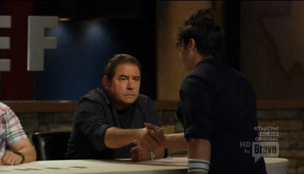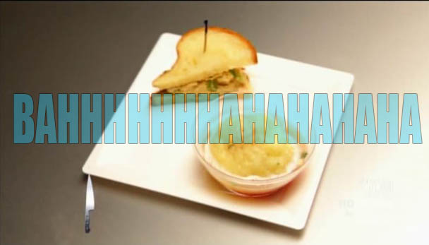 Paul wins the challenge and $15,000 with his lettuce wrapped turkey bulgogi. I think Paul is up to, like, $300,000 at this point? He can buy himself another car like that sweet ride he had in that prom picture! And wear a tuxedo every day! THE DREAM! They go back to the stew room and send Ed, Scrunchie Chris, and Sarah out for elimination. Sarah made a good meatball, but it wasn't elevated. Ed's bulgogi wasn't healthy. He explains that it's traditionally served with rice, which is empty calories, which is why he served it on a hunk of bread. The judges point out the obvious. Ed grinds his jaw. What a dope. And, of course, the criticism of Scrunchie Chris is that he made a chicken salad sandwich. Some weeks the judges talk about how hard it is to make a decision. This is not really one of those weeks.