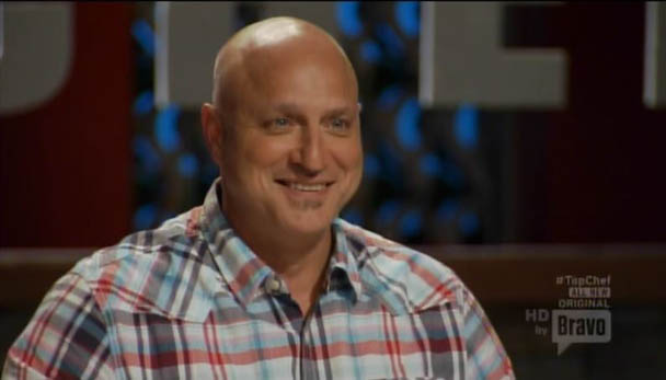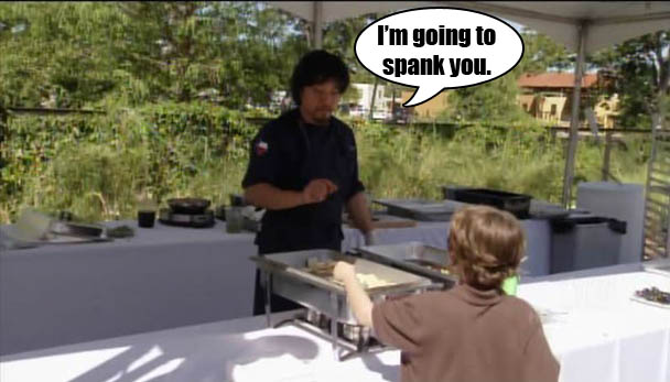 The judges like Paul's bulgogi wrap and they LOVE Lindsay's lamb meatball. Everything else seems to suck. That's weird. You mean they DIDN'T like Scrunchie Chris's 12-hour old chicken salad sandwich with TOFU MAYONNAISE? Huh. I guess there's just no pleasing these crazy judges! Paul, Lindsay, and Grayson are brought to the Judges' Table and told that they had the winning dishes, for the most part. Grayson didn't really have a winning dish because her dish was chicken salad sandwich. Tom is like, huh? Grayson gets real defensive and explains that hell yeah she thought she could make a fancy, improved chicken salad sandwich and Tom is just like uhh. Grayson doesn't even understand what Tom is saying to her right now. Read his lips, Grayson: Chicken. Salad. Sandwich.
