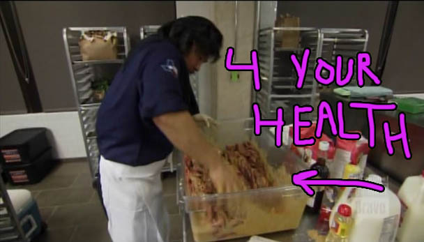 For this week's Elimination Challenge, the teams of judges will now be competing against each other. Each team has to pick a dish and a side and both chefs will cook their own variations on that dish and one chef will win and one chef will lose. Eek! They're cooking for a food drive "block party" for 200 people. (The "block party" is taking place at a brewery on a lawn, so I'm not sure why they didn't just call it a "lawn party" or a "party" but apparently it's a "block party." Everything's block party in Texas.) The chefs split off to pick their dishes. Lindsay and Sarah are going to make meatballs. Paul and Ed are going to make Korean barbecue. And Grayson and Scrunchie Chris are going to make...chicken salad sandwiches?! Uhhhhh. Chris explains that he doesn't want to make chicken salad sandwiches but he doesn't have any better ideas. Really? How about ANY IDEAS. Literally any idea would be better than chicken salad sandwiches. You're on fucking TV for COOKING. Guys, come on. YOU BETTER DRUMSTICKLINE. After they announce their dishes, Padma says "all of those sound great," which has to be on a pre-written cue card, or maybe she was too drunk and didn't hear one team say "we are making chicken salad sandwiches." But the twist is that this is a food drive sponsored by Healthy Choice, so all the dishes have to be healthy. UH OH! Just kidding. The chefs all freak out, but all of those dishes seem like pretty easy dishes to create healthy variations on. Although, Ed explains that Korean barbecue is already healthy so it's a shoe in, which sounds wrong. I love Korean barbecue but I am never confused on why there isn't a Korean barbecue stand set up INSIDE my gym.