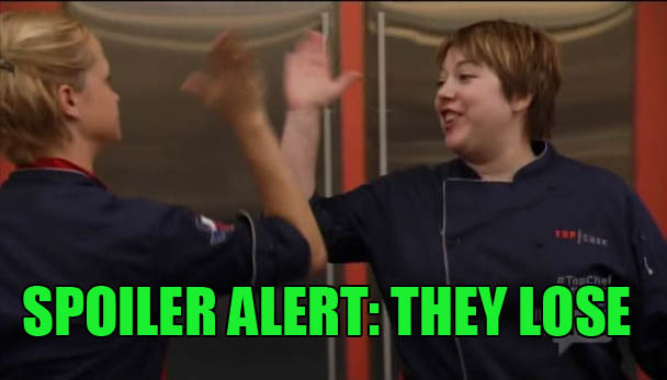So, Paul and Ed are ineligible for the $$$$ prize, and once again, Padma tells them that it's a shame because the flavors are really good. Ugh. Such a bitch! I love her! It's so easy to tell someone who can't possibly win that they probably would have won even if that's not true. Such a knife in the face. Twist the knife in my face! The judges liked the other two dishes, supposedly. I mean, they have to pretend like there's some tension over who could win and since there's only two dishes to choose from, they have to be complimentary. In the end, Grayson and Scrunchie Chris's chili bacon shrimp fettucine wins even though they were the last team to complete the mise portion of the challenge and also Grayson's pasta looked so bunk. HUH! Forget it, Gabe, it's Top Chef Town.