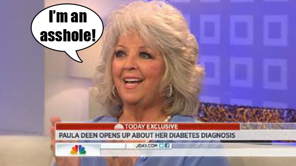 Although the news broke last week, Paula Deen appeared on the Today Show this morning with Al Roker to announce to the world that she has been diagnosed with type 2 diabetes. Normally this story would make the cover of this month's Duh Aficionado Magazine (order your back issue of "Dr. Atkins Dies of Heart Attack" here) and that would be that because OF COURSE Paula Deen has type 2 diabetes. Except it turns out that she has HAD IT FOR THREE YEARS and just didn't bother telling anyone as she continued her high-speed ride on top of the Butter Bullet Train. Ugh. And it just so happens that her announcement has coincided quite nicely with her signing of a multi-million dollar sponsorship deal with a pharmaceutical company for a diabetes drug. OH COOL, THIS IS COOL. What a fucking asshole! Anthony Bourdain already said it best: "When your signature dish is hamburger in between a doughnut, and you've been cheerfully selling this stuff knowing all along that you've got type 2 diabetes... It's in bad taste if nothing else." Look, obviously our thoughts and prayers are with Paula Deen and her family during this delicious difficult time, but good grief. The worst part is how George W. Bush she is being about the whole thing. Like, OK, you're a greedy (obviously, I mean, obviously, it is crazy how obvious it is that Paul Deen is greedy with EVERYTHING) jerk who does not care about anything other than getting as much of everything as you possibly can into your body and/or wallet. That's fine. But then just do that. Drop the AW SHUCKS routine you FUCKING MONSTER. Look at this shit: