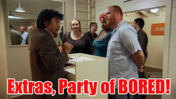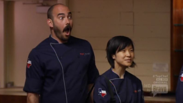 The chefs are brought into a giant, empty events space. They're getting 8-way married! Congratulations! No, they are not getting 8-way married (because no one will marry Beverly. Poor Beverly!) they are getting 8-way restaurant warred. No Quickfire this week. All Elimination Challenge all the time. Everyone is, as they are every season, WAY too excited about the announcement that this is Restaurant Wars. Seriously, I don't get it. As a viewer, I hate Restaurant Wars, and that's as a viewer. I can only imagine what a miserable nightmare it is as an actual contestant. So everybody take it down, like, six notches. Seriously, look at this face: