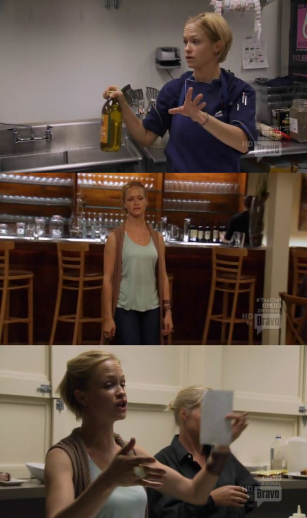 And now it is the ladies' turn. Lindsay takes the front of the house because she partied at Senor Frogs one summer or something. We are nine weeks in and I don't know anything about Lindsay other than that her food seems to be very middle-of-the-road and one time she went to Mexico. Everyone's being a real asshole to Beverly. At this point, it must be Beverly's fault. Back when it was just Heather being Heather it seemed like maybe Beverly was getting a raw deal, but if everyone hates her something must be up, right? Isn't that how hate works? She makes braised short ribs and will also be responsible for cooking Lindsay's halibut, which Lindsay seems to be really comfortable and cool with just kidding yikes what a nightmare. The service in the "restaurant" is terrible because Lindsay keeps coming back to the kitchen to yell at Beverly. It just seems like fun. Now I understand why everyone gets so excited about Restaurant Wars. It's fun! Every face Lindsay makes is rill bitchy.