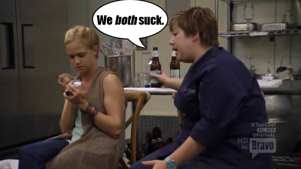 The ladies get called to Judges' Table and against all odds (just kidding, 50/50) they had the winning restaurant. Despite all their fighting and Lindsay's Yuck Faces and a lackluster piece of halibut, they did have the best food of the Wars, which is what this competition is about, in theory. Congrats, ladies. And the overall winning dish, with the pride that comes from that and also a three-liter bottle of wine (?!) goes to Beverly. Haha. Sarah and Lindsay are so pissed. What assholes! Did you really need a three-liter bottle of wine that bad? Go buy one! They send the boys off to the Judges' Table to be judged and once the boys are gone Sarah starts in AGAIN, explaining that she thinks Lindsay deserved to win for all of her hard work. JESUS, LET IT GO! MAKE A SAUSAGE OUT OF YOURSELF AND THROW HALF OF YOU IN THE GARBAGE BECAUSE THERE WAS TOO MUCH FENNEL. Sarah is the new The Worst.